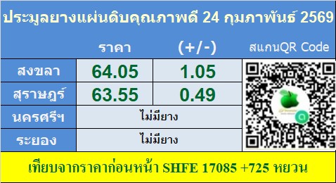 ราคาประมูลแผ่นดิบ : ตลาดสงขลา 64.05 บาท/กก. ราคาเพิ่มขึ้น 1.05บาท/กก. ปริมาณยาง 7,821 กก.