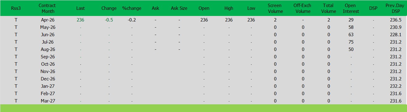 ราคาปิดตลาดยาง SICOMประจำวัน พฤหัสฯ ที่ 26มีนาคม2569ราคายาง RSS3 ราคาเดือนเม.ย. ราคาลดลง -0.5เซนต์สหรัฐ ปิดที่ 236 เซนต์สหรัฐ