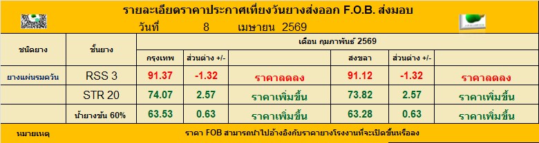 รายละเอียดราคาประกาศเที่ยงวันยางส่งออก F.O.B. ส่งมอบ ประจำวัน พุธ ที่ 8 เมษายน 2569