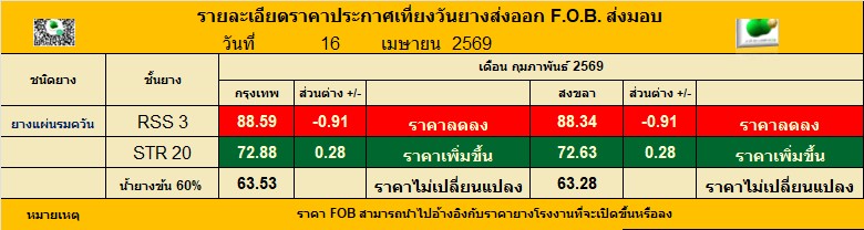 รายละเอียดราคาประกาศเที่ยงวันยางส่งออก F.O.B. ส่งมอบ ประจำวัน พฤหัสฯ ที่ 16  เมษายน  2569