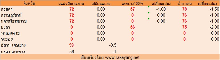 จังหวัด สงขลา ยางแผ่นดิบคุณภาพ 3 = 72บาท/กก. ราคาไม่เปลี่ยนแปลง เศษยาง 57 บาท/กก. ราคาลดลง -1 บาท/กก. น้ำยางสด ราคา ณ โรงงาน 78 บาท/กก. ราคาลดลง -1.50บาท