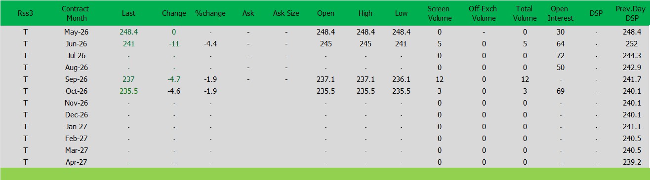 ราคาปิดตลาดยาง SICOMประจำวัน ศุกร์ ที่ 17เมษายน2569ราคายาง RSS3 ราคาเดือนพ.ค. ราคาลดลง 0เซนต์สหรัฐ ปิดที่ 248.4 เซนต์สหรัฐ