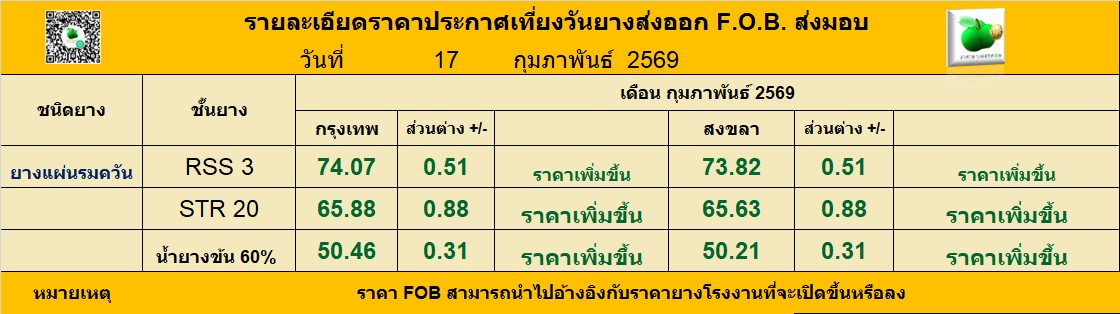 รายละเอียดราคาประกาศเที่ยงวันยางส่งออก F.O.B. ส่งมอบ ประจำวัน อังคาร ที่ 17  กุมภาพันธ์  2569